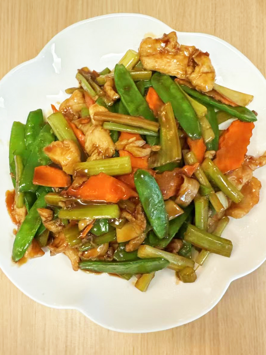 Stir-fried chicken with snow peas and celery at Shun Feng Restaurant,a Chinese Restaurant in Santa Cruz